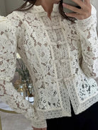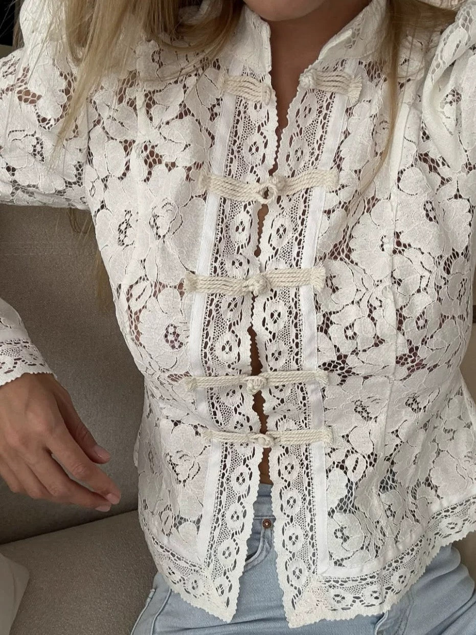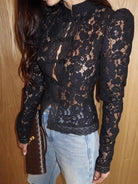 • Design details: Fitted lace blouse with long sleeves and intricate floral pattern throughout. Designed with a refined, semi-sheer finish that creates an elegant contrast against the skin. A statement piece that adds texture and femininity to both casual and elevated looks.