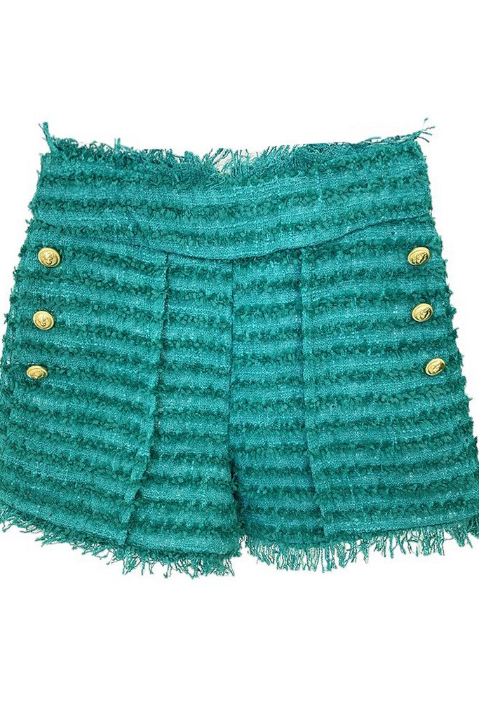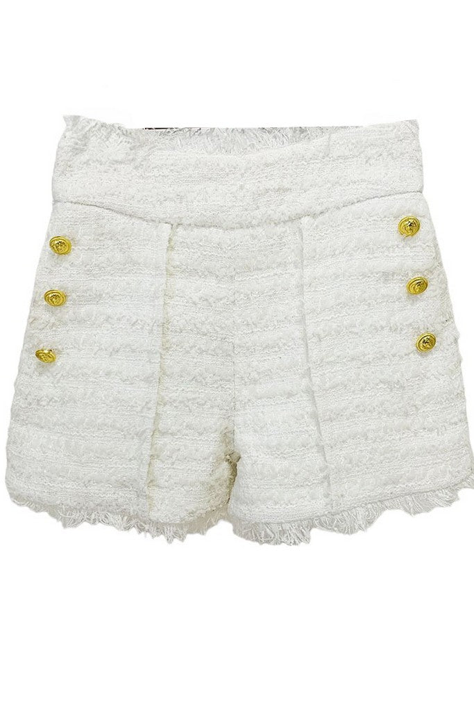 - Design details:Tweed High Wasted Shorts With Gold Button Side Pocket Detail. Matching Blazer Available.