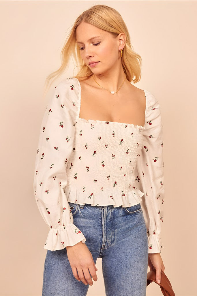 • Design details: A square-neck linen blouse with long sleeves and a delicate printed pattern, a perfect mix of natural texture and refined femininity. Ideal for pairing with denim or tailored pieces.