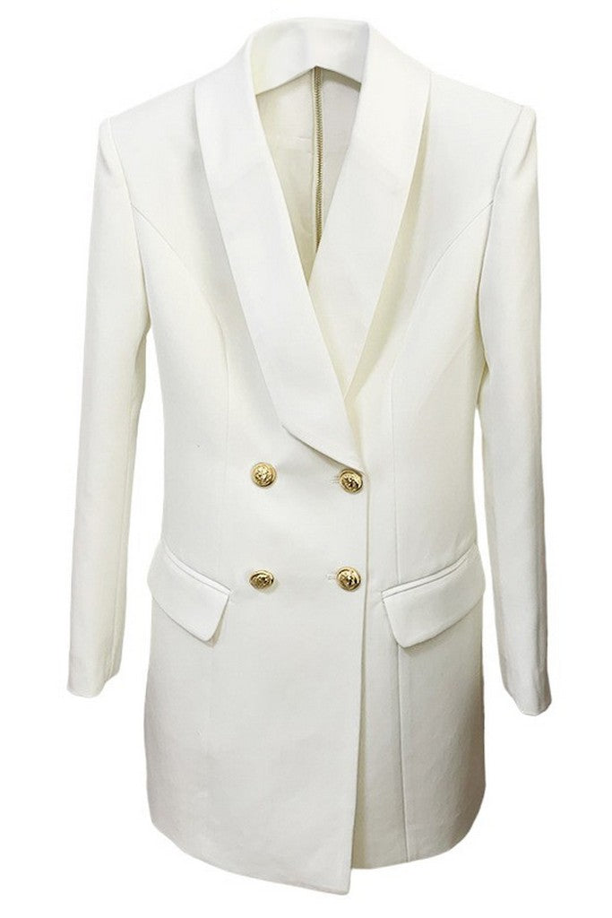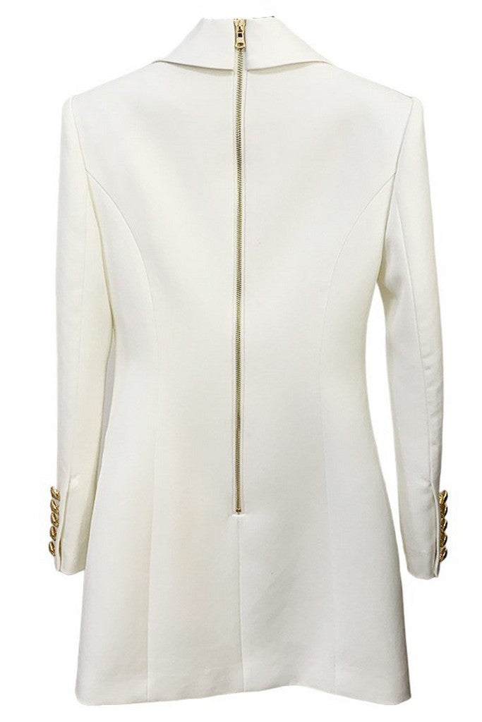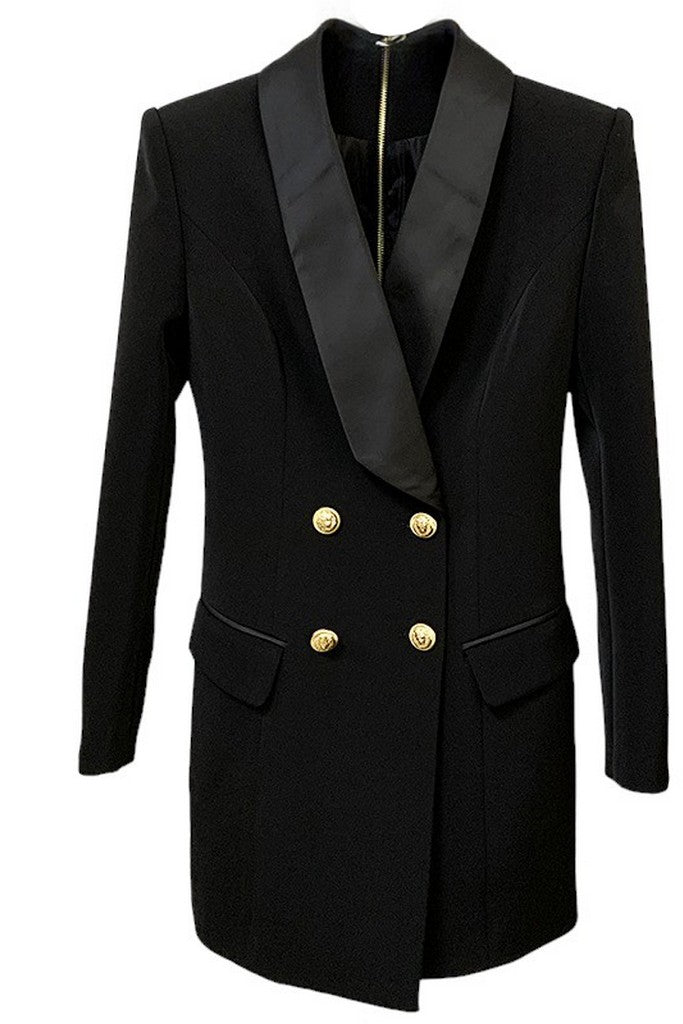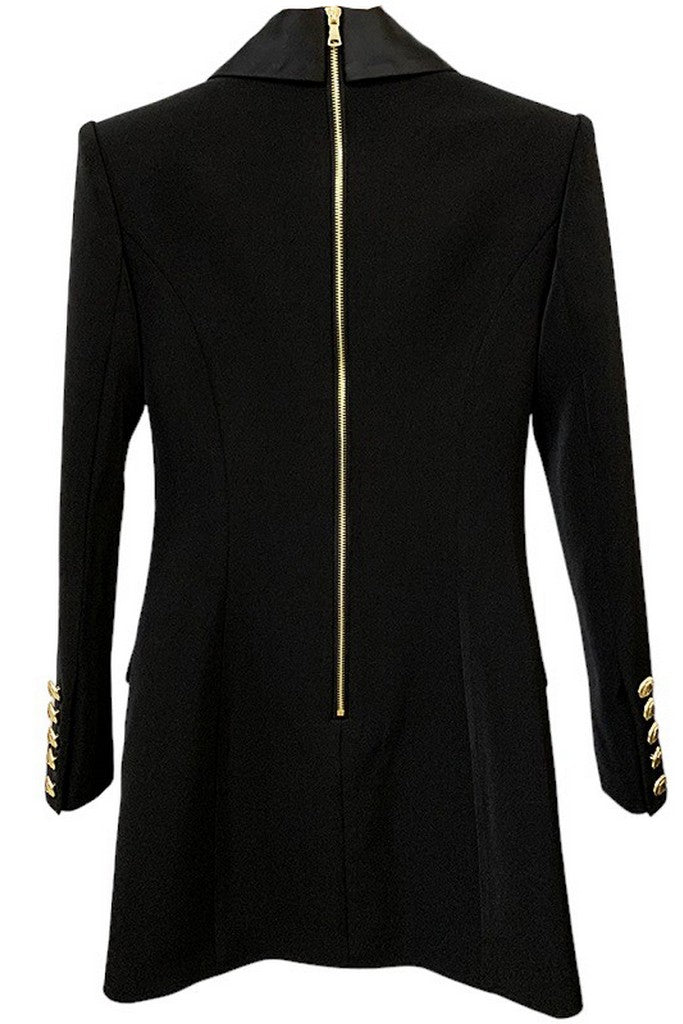 - Design details: Tuxedo Style Mini Dress With Satin Collar And Gold Button And Back Zipper Detailing.