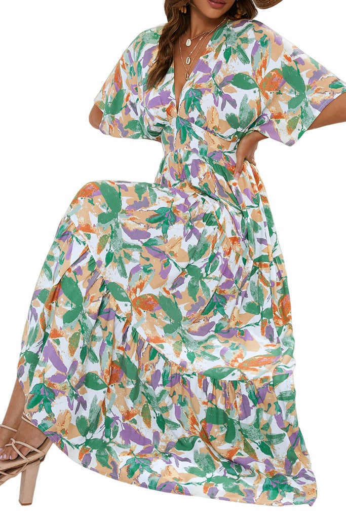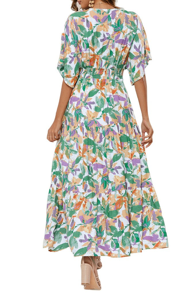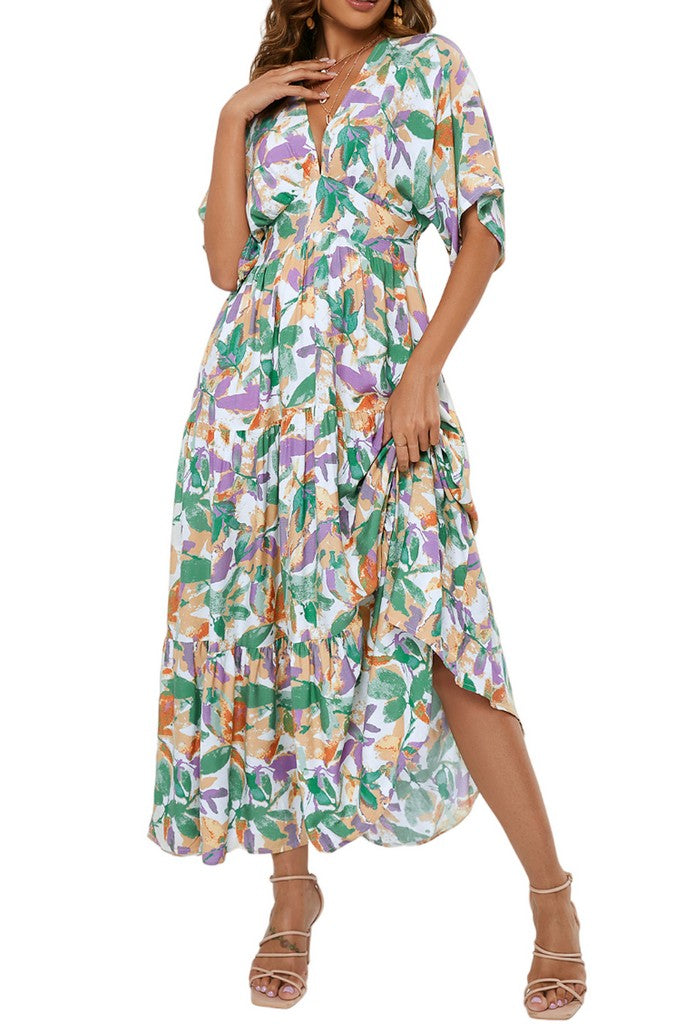 - Design details: ruffled, a-line silhouette, maxi length, v-neck, elbow sleeve