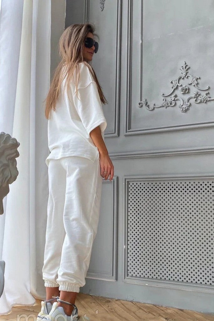 • Design details: Effortlessly chic — this crisp white ensemble pairs a loose long-sleeve shirt with fluid trousers. Perfect for understated elegance on warm days or minimalist evenings.