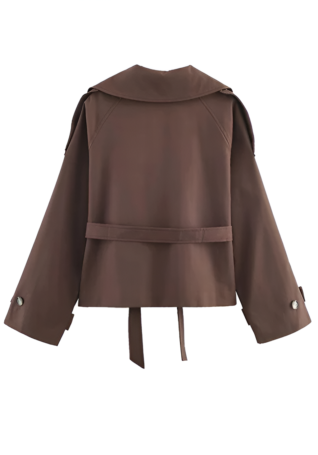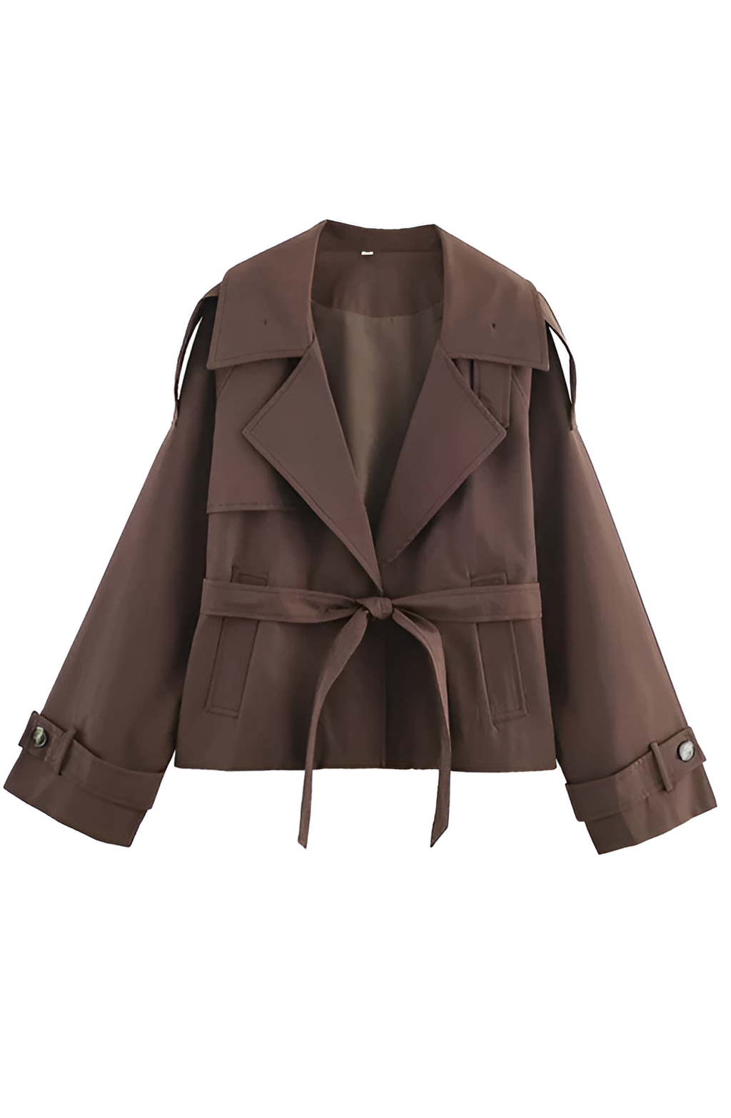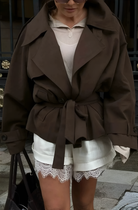 • Design details: A modern short trench coat in a rich chocolate shade, featuring a relaxed silhouette with a waist-defining belt. Effortlessly chic and incredibly versatile, perfect for casual street looks, city walks, and elevated everyday outfits.