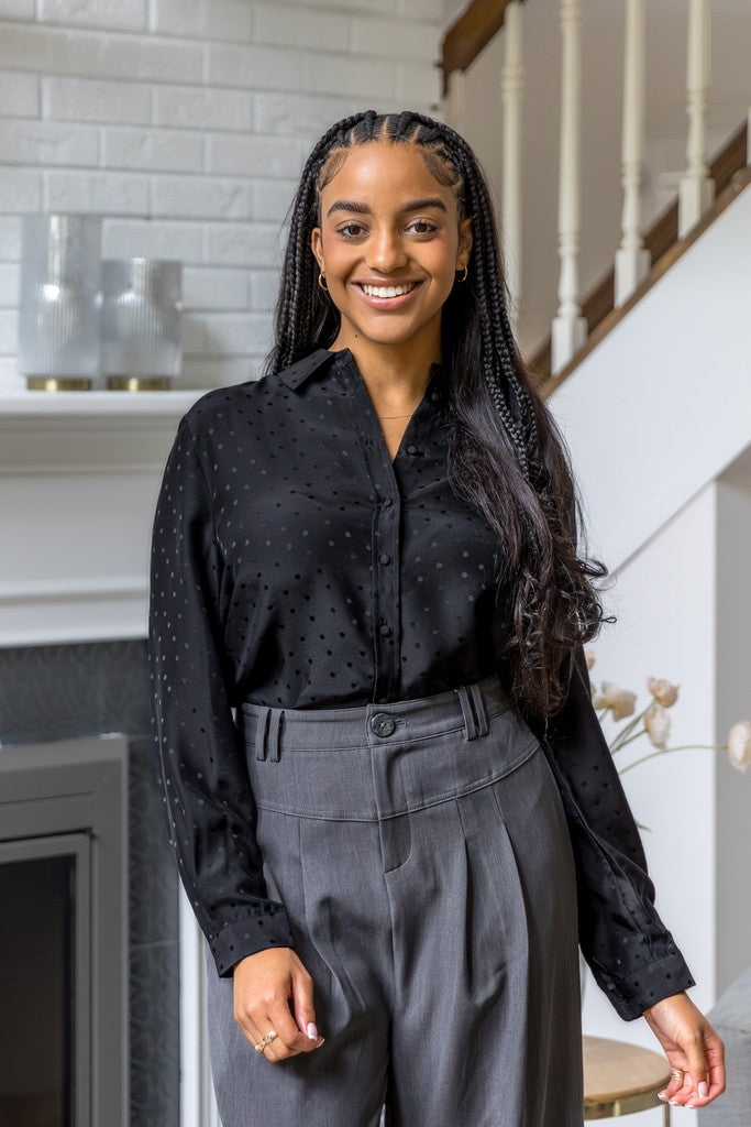 • Design details: Silk button down with monochromatic polka-dots.